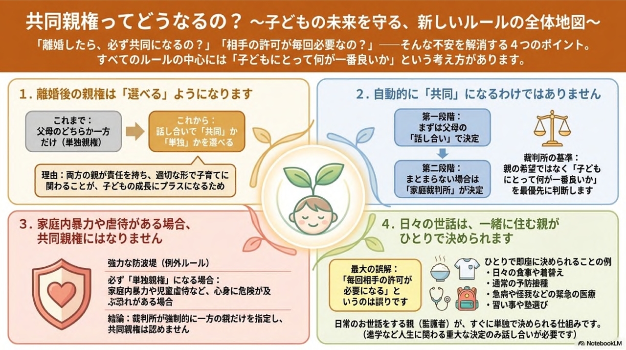 これまでの民法では離婚後は父母いずれかの単独親権に限られていましたが、改正により父母の協議で「共同親権」を選択することが可能となりました。協議が調わない場合は家庭裁判所が判断します。